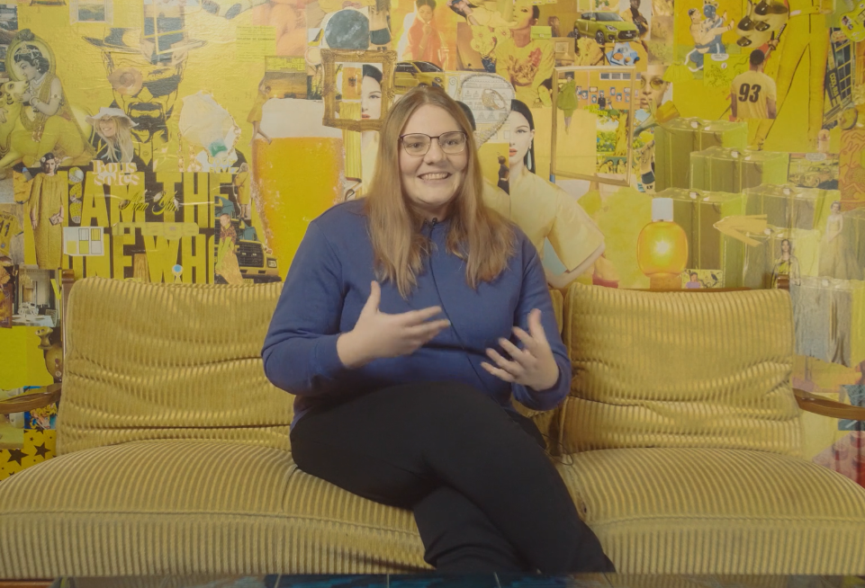 D’Julie (Handicap invisibel – MS), 31 Joer aal, sëtzt a senger Stuff. Mir gesinn et fir den Ament just vun hannen um Canapé sëtzen. D’Kamera geet ëmmer méi no. D’Mauer hannert dem Julie ass ganz giel, et si lauter Collagen aus Zeitungen un der Mauer gepecht.