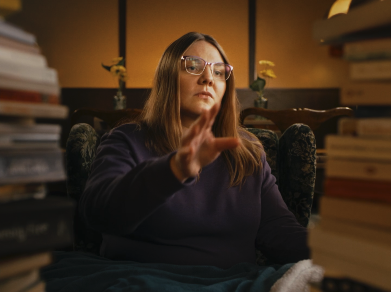 D’Kamera dréint ronderëm d’Julie, mir gesi wéi et e Buch liest. Et leien immens vill aner Bicher ronderëm him.