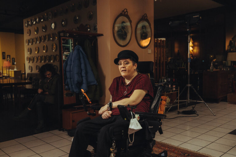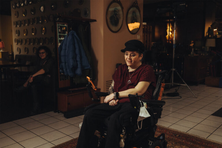 D’Marie, eng Fra am Rollstull mat Tattooss, sëtzt am Restaurant. Mir gesi si vun hannen. Si ass um Telefon.